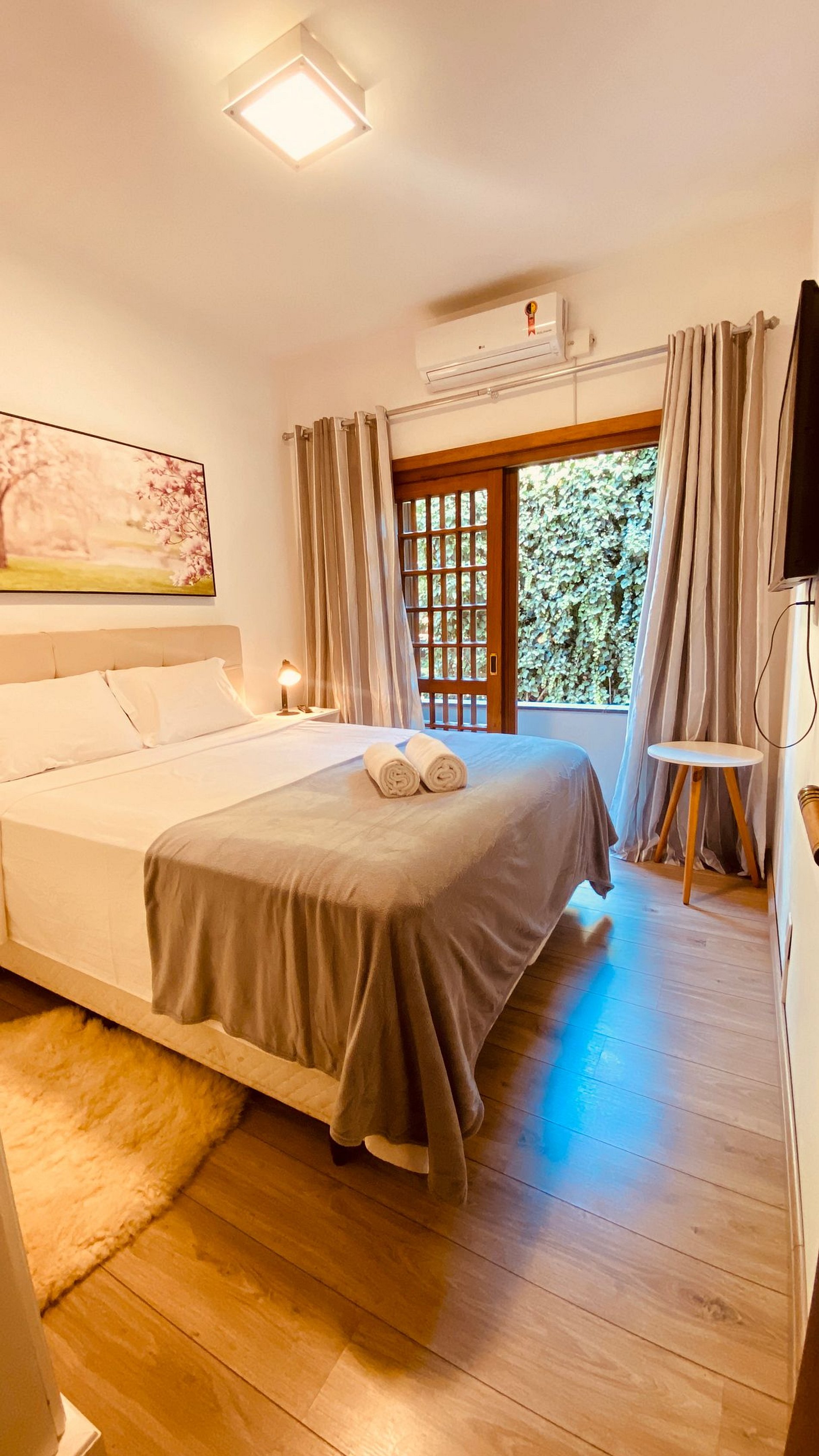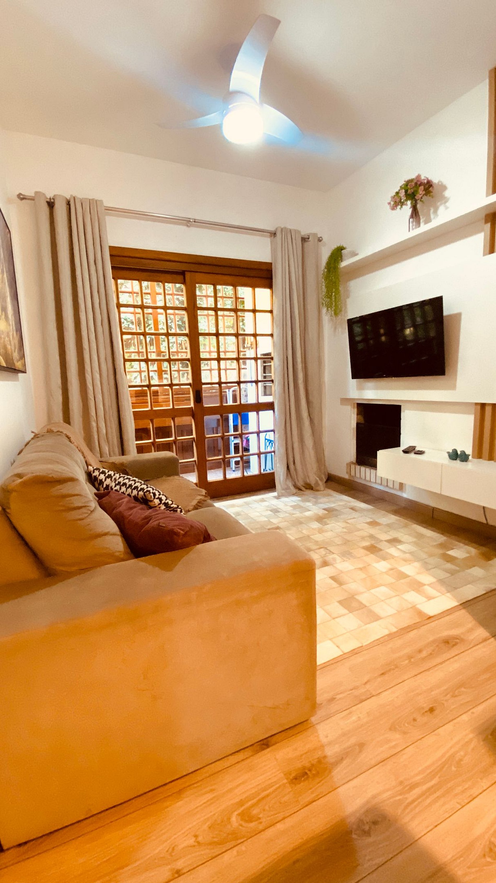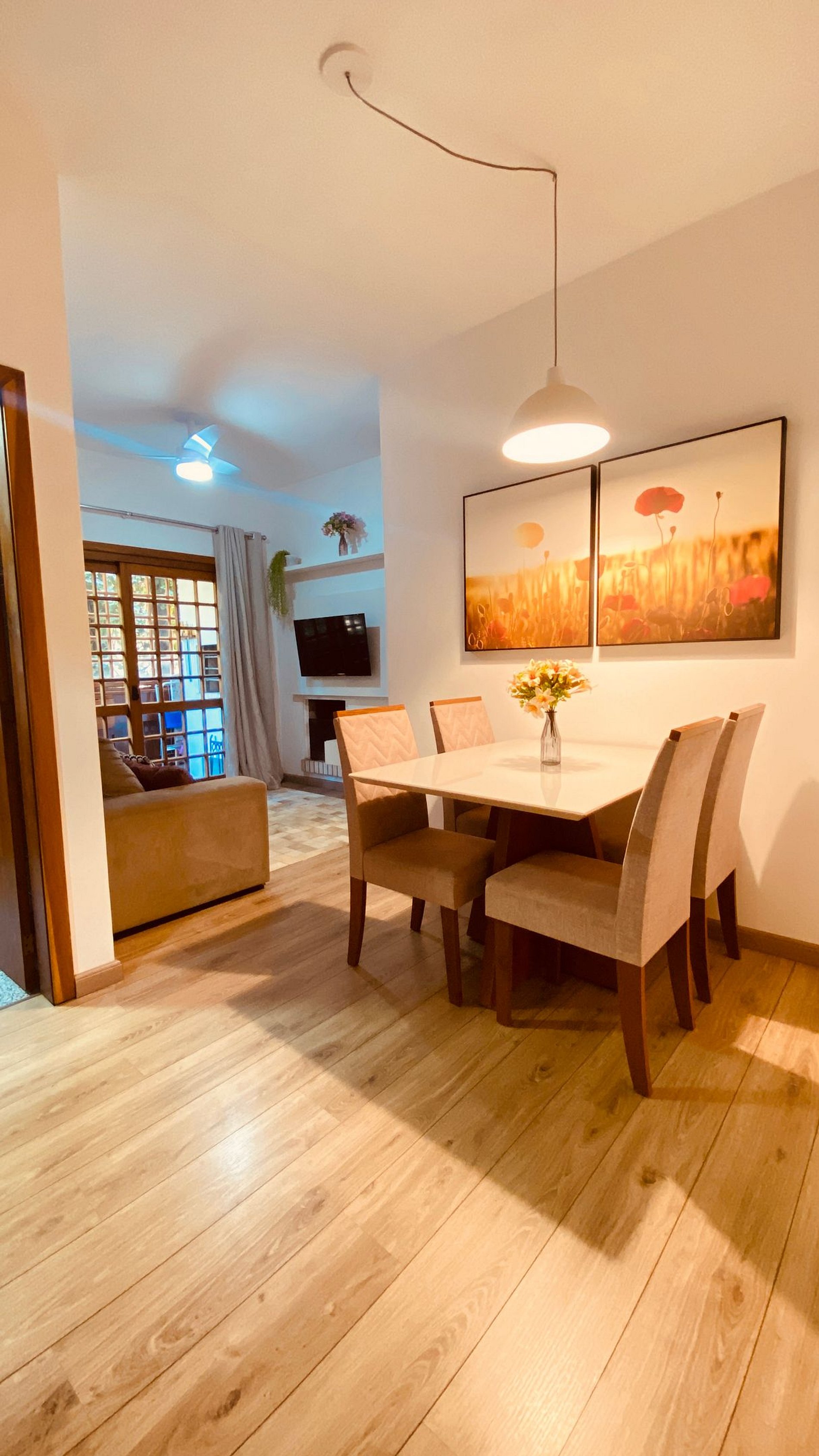 Conforto Térmico e Tecnologia: O uso do ar-condicionado em todos os ambientes garante que o hóspede nunca sofra com a umidade ou o frio extremo da Serra. A integração da sala de TV com a sala de jantar cria um ambiente amplo e moderno, ideal para quem busca o padrão de um hotel boutique com a liberdade de uma casa.