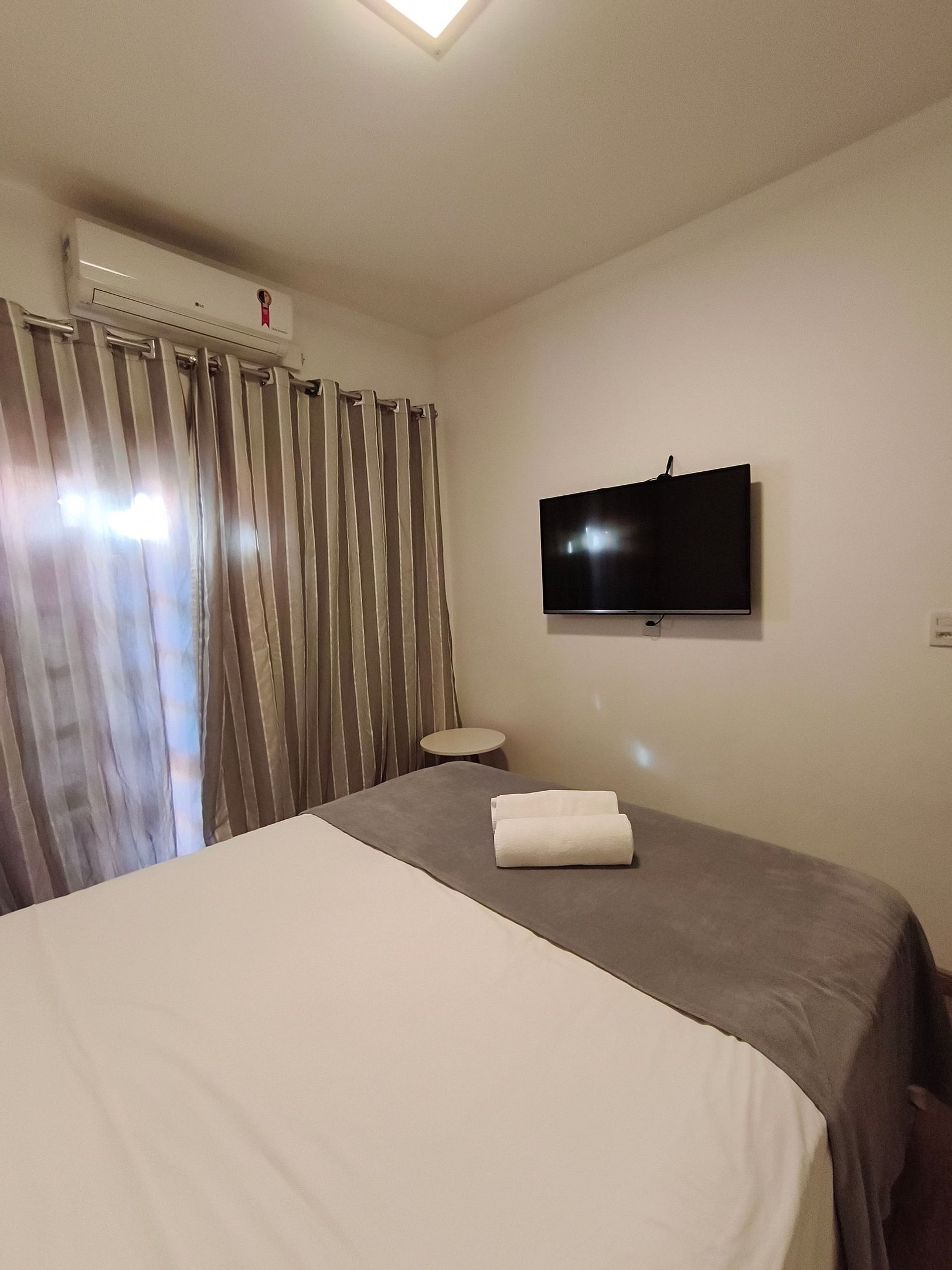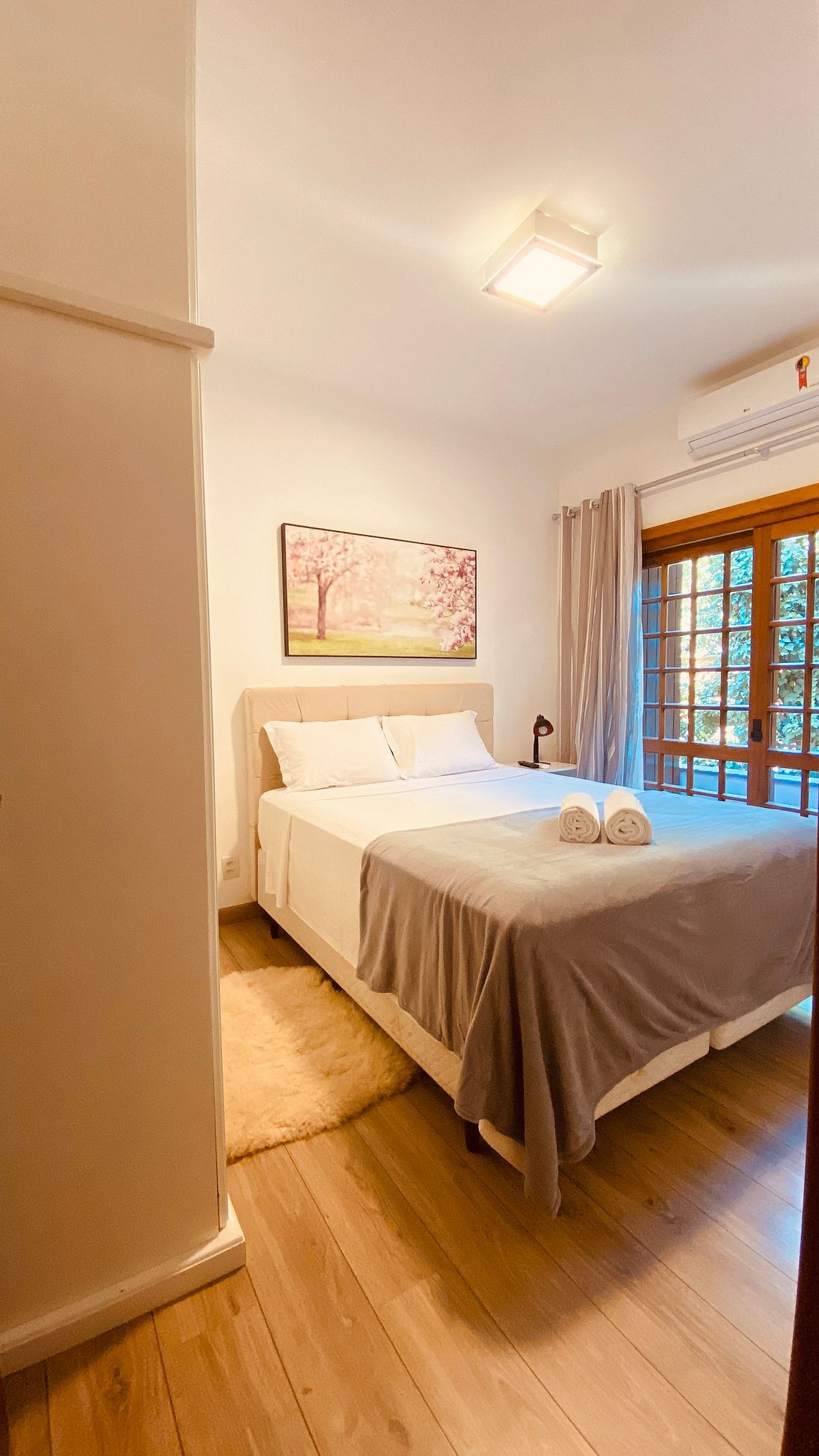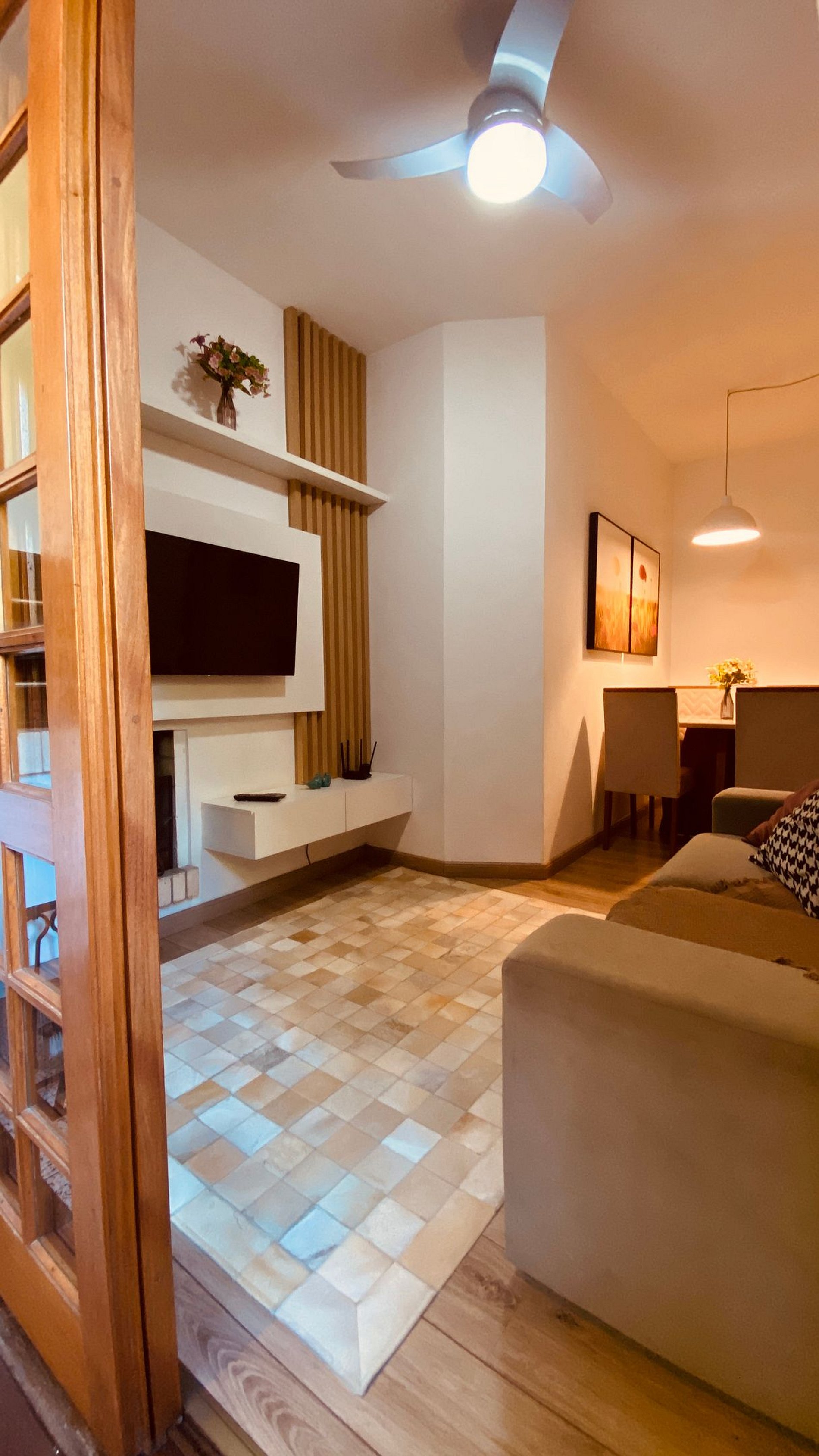 Conforto Térmico e Tecnologia: O uso do ar-condicionado em todos os ambientes garante que o hóspede nunca sofra com a umidade ou o frio extremo da Serra. A integração da sala de TV com a sala de jantar cria um ambiente amplo e moderno, ideal para quem busca o padrão de um hotel boutique com a liberdade de uma casa.