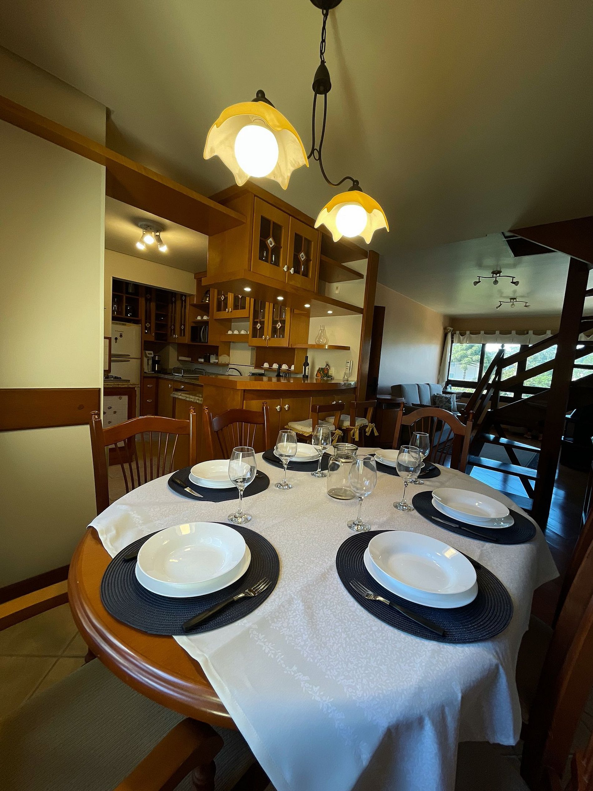 No primeiro piso temos a sala de TV, sala de jantar, cozinha completa, área de serviço, uma suíte e uma outra sala com um sofá-cama de casal e lavabo. No segundo piso, temos uma suíte familiar com uma cama queem e duas camas auxiliares de solteiro e no quarto ao lado, uma cama queem com auxiliar, completando assim 12 hóspedes no apartamento. Ar condicionado no andar superior.