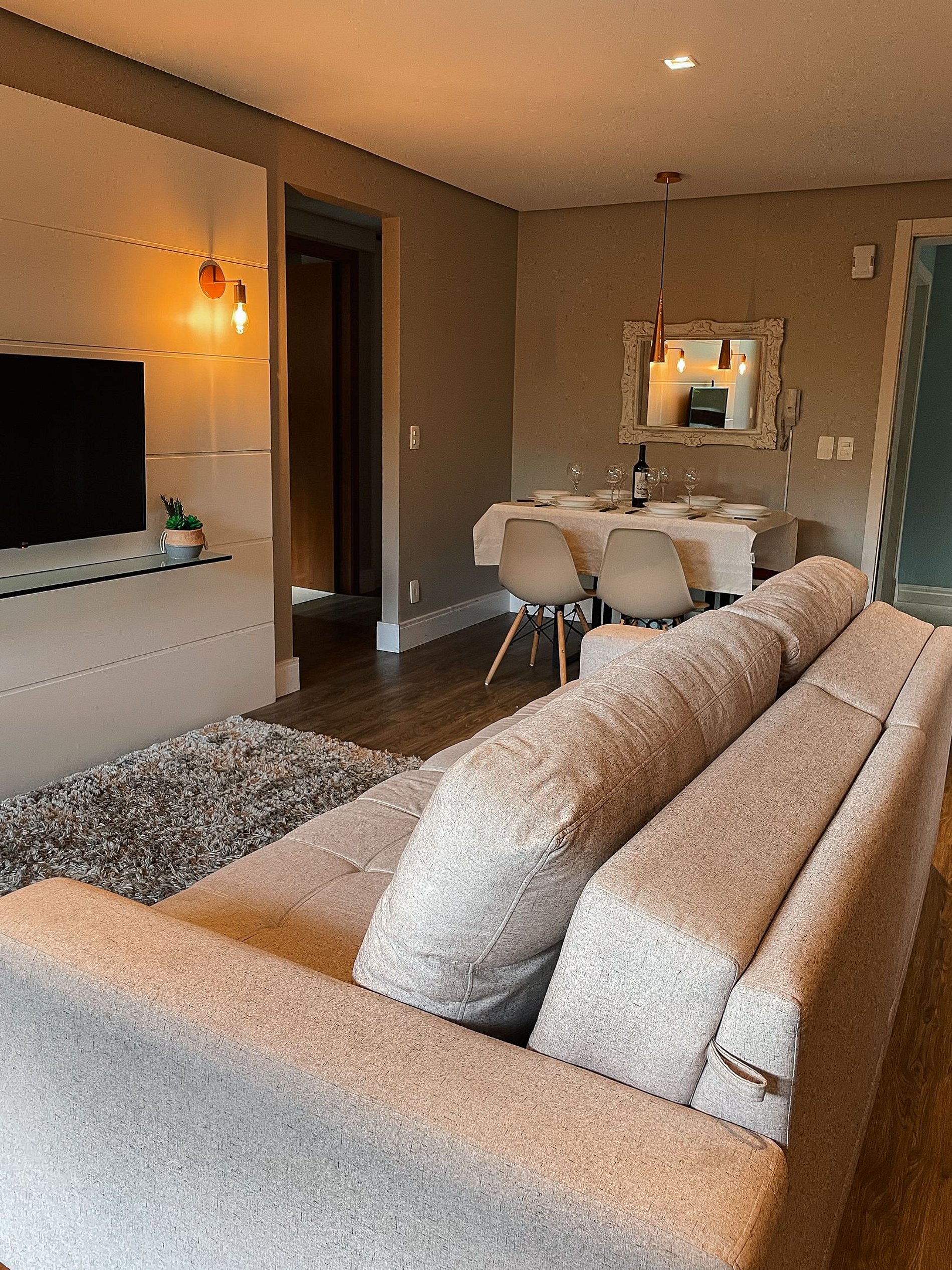 - TV Smart e um belo sofá cama com espaço amplo para 2 pessoas, mesa de jantar com luz amarela de decoração.