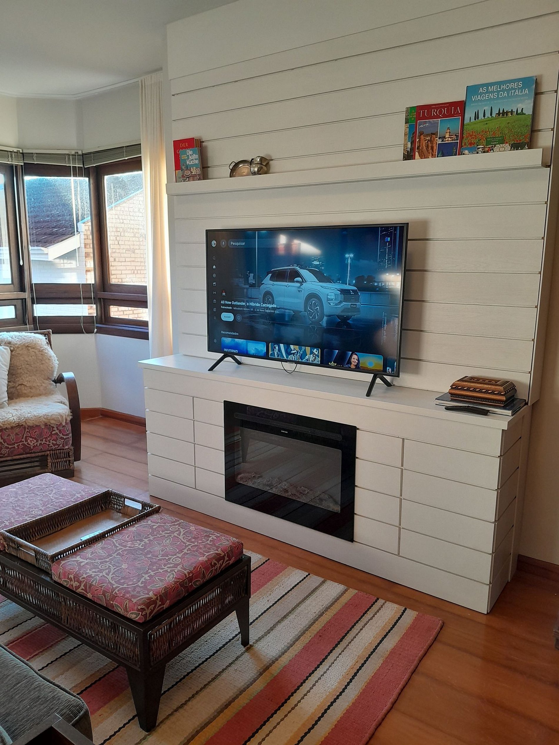 - Sala de TV com sofá de 3 lugares e 2 poltronas individuais, TV Smat de 50" e lareira elétrica.
