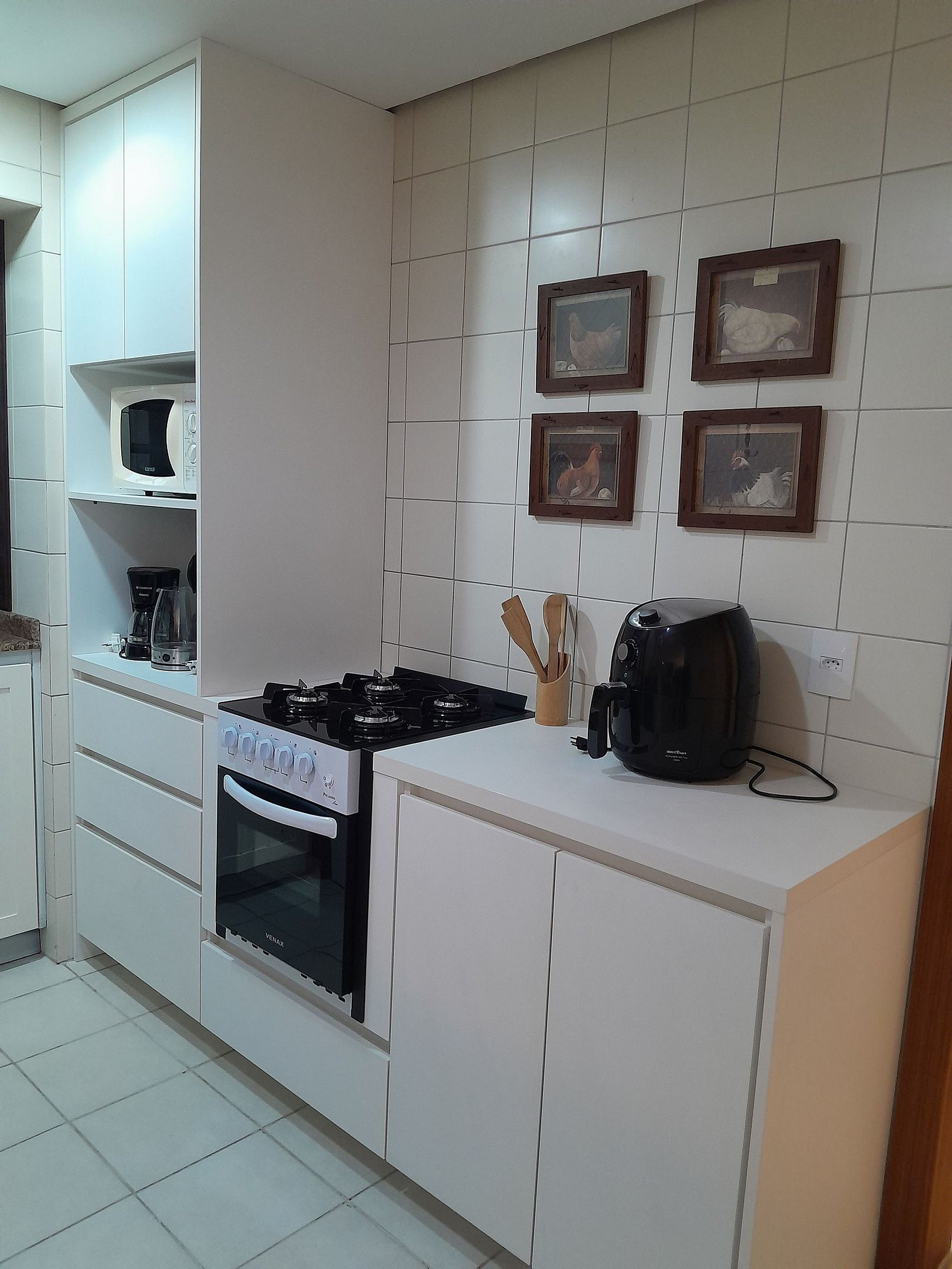 - Cozinha bem equipada com geladeira duplex, fogão 6 bocas, pia com água aquecida, churrasqueira com exaustor, balcão e utensílios básicos como: